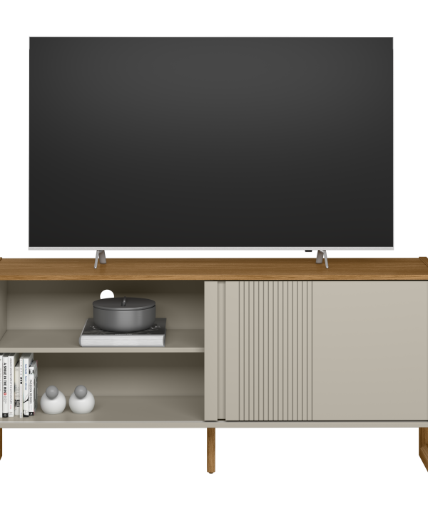 El Rack Gold cuenta con puerta corrediza con detalles frisados y manija incorporada. Fue diseñado para televisores de hasta 55 pulgadas, cuenta con un estante para acomodar objetos decorativos y dispositivos electrónicos y también patas laterales con marco.